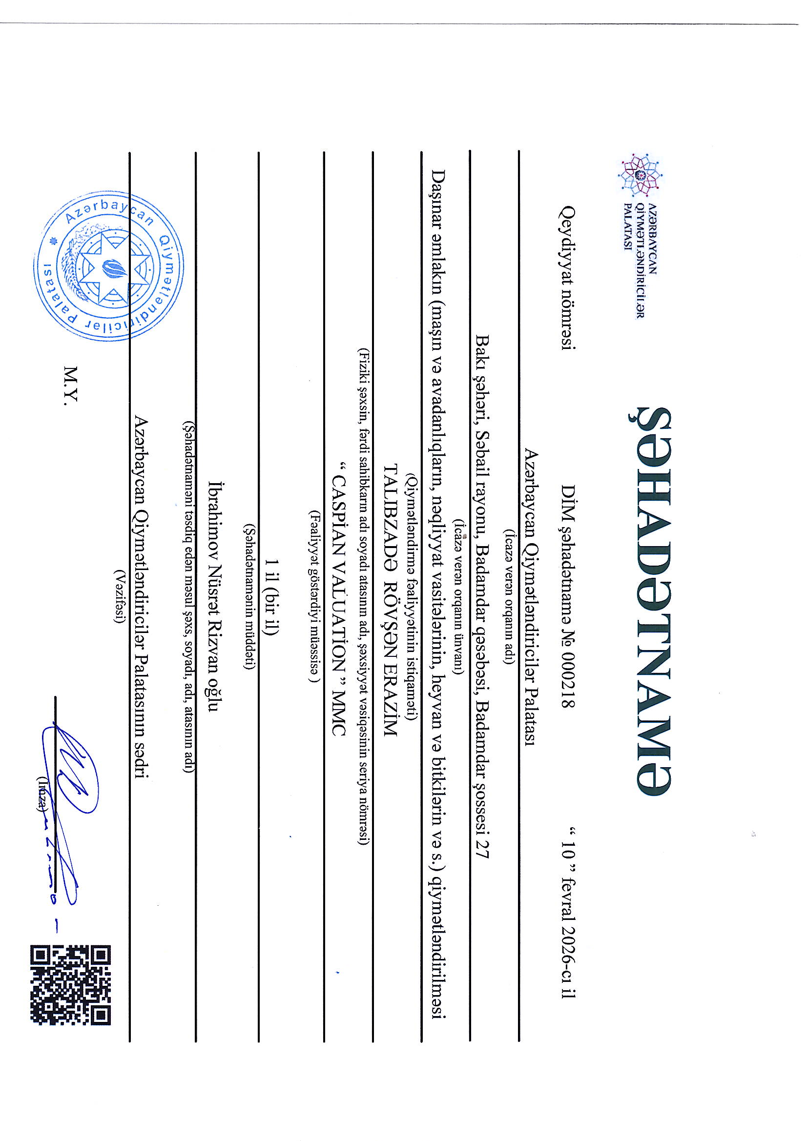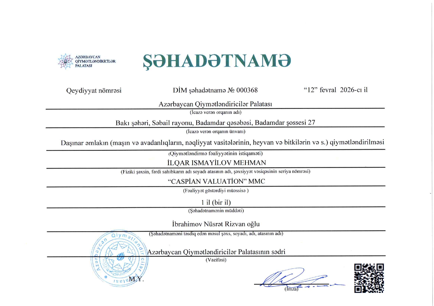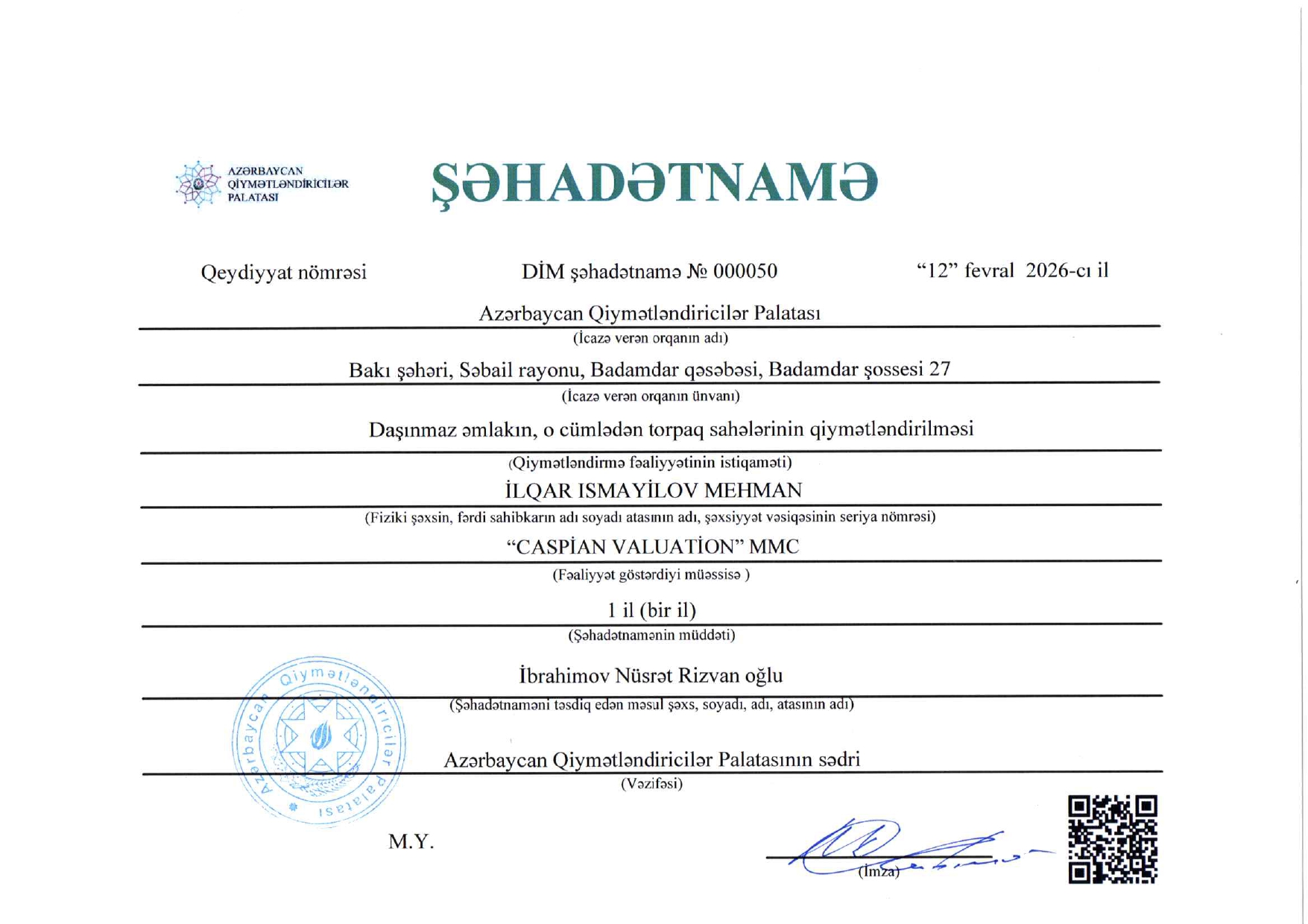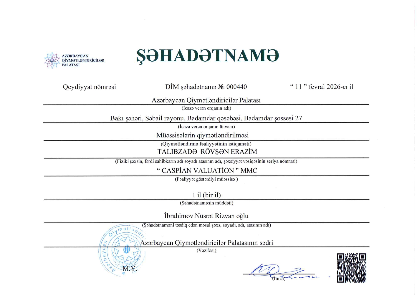 Azərbaycan Qiymətləndiricilər Palatasının üzvü olan «Caspian Valuation» MMC 2011-ci ildən daşınar və daşınmaz əmlakın qiymətləndirilməsi və ekspertizası sahəsində peşəkar təcrübəyə malikdir. Şirkətin 3 əməkdaşı Dövlət İmtahan Mərkəzində keçirilmiş imtahanlarda müvəffəqiyyət qazanaraq Qiymətləndiricinin İxtisas Şəhadatənaməsini əldə etmişlər. «Caspian Valuation» MMC fəaliyyəti üzrə hüquqi və fiziki şəxslərə Azərbaycan Respublikasının “Qiymətləndirmə fəaliyyəti haqqında” Qanununa, Beynəlxalq Qiymətləndirmə Standartlarına (BQS), “Milli Qiymətləndirmə Standartları”na (AzS), “Dövlət Məhkəmə Ekspertizası fəaliyyəti haqqında” Azərbaycan Respublikasının Qanununa müvafiq olaraq xidmət göstərir. Qiymətləndirmə fəaliyyəti ilə yanaşı aşağıdakı xidmətlər də təşkilatın fəaliyyət çərçivəsinə daxildir. Əmtəəşünaslıq, tikinti-texniki ekspertizası; İnventarizasiya; Biznes planların tərtibi; Mal qalığının hesablanması; Eskiz layihələrin çəkilməsi, koordinatların müəyyən edilməsi; Əldən çıxmış faydanın hesablanması; Smeta layihələrinin tərtibi; Dəymiş ziyanın hesablanması; Konsaltinq və kompleks marketinq sahəsi və s.