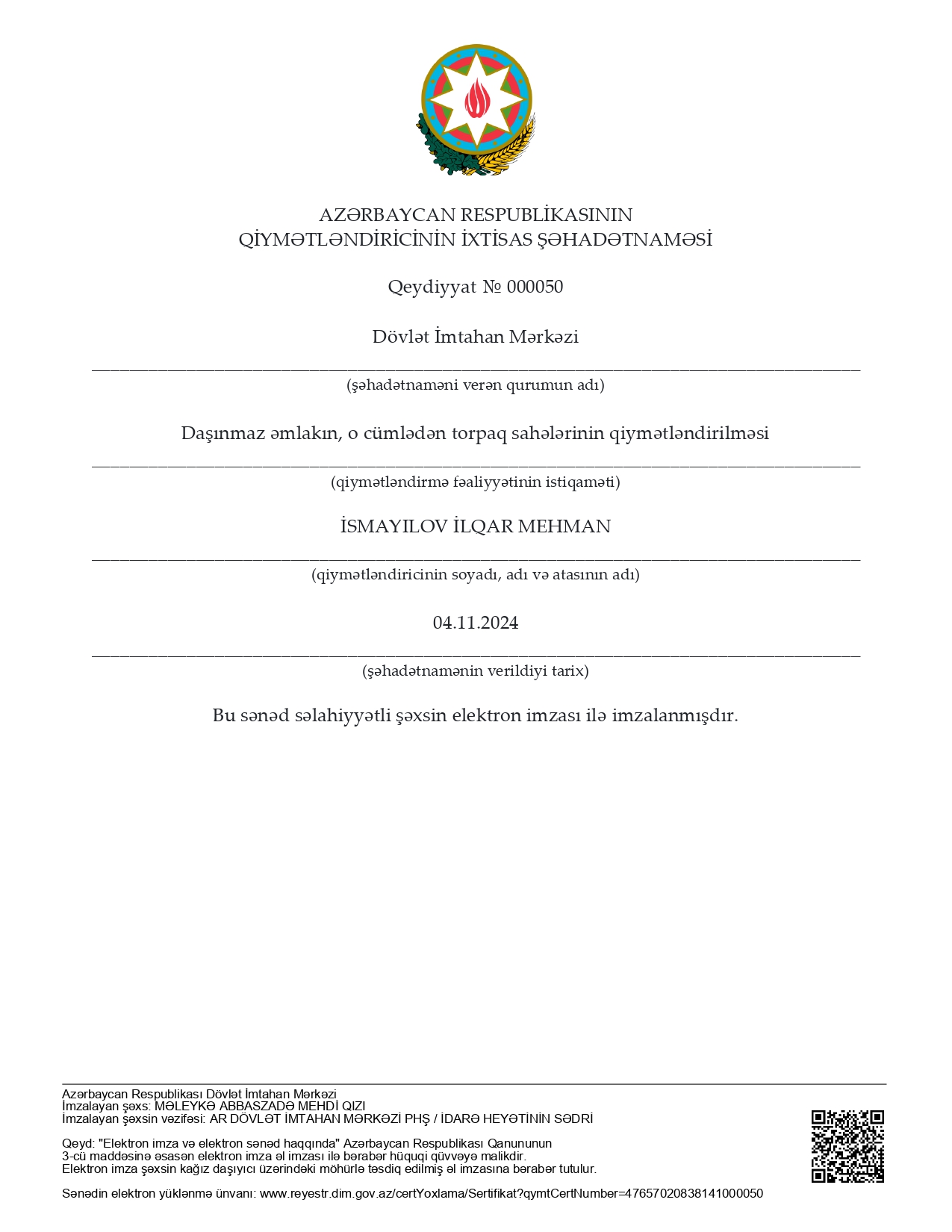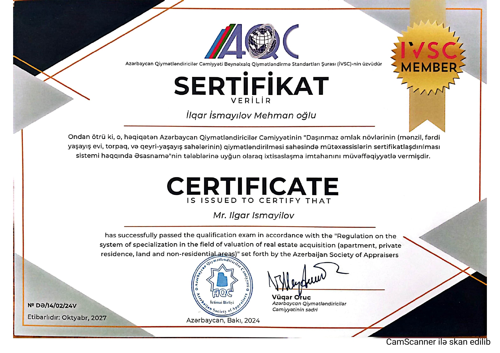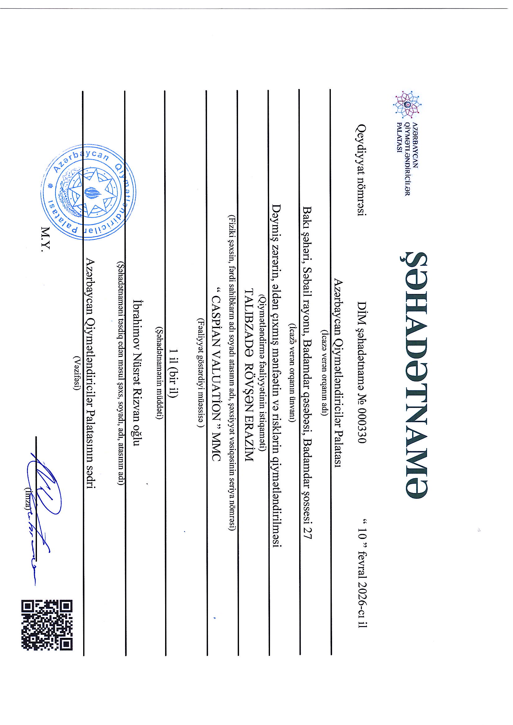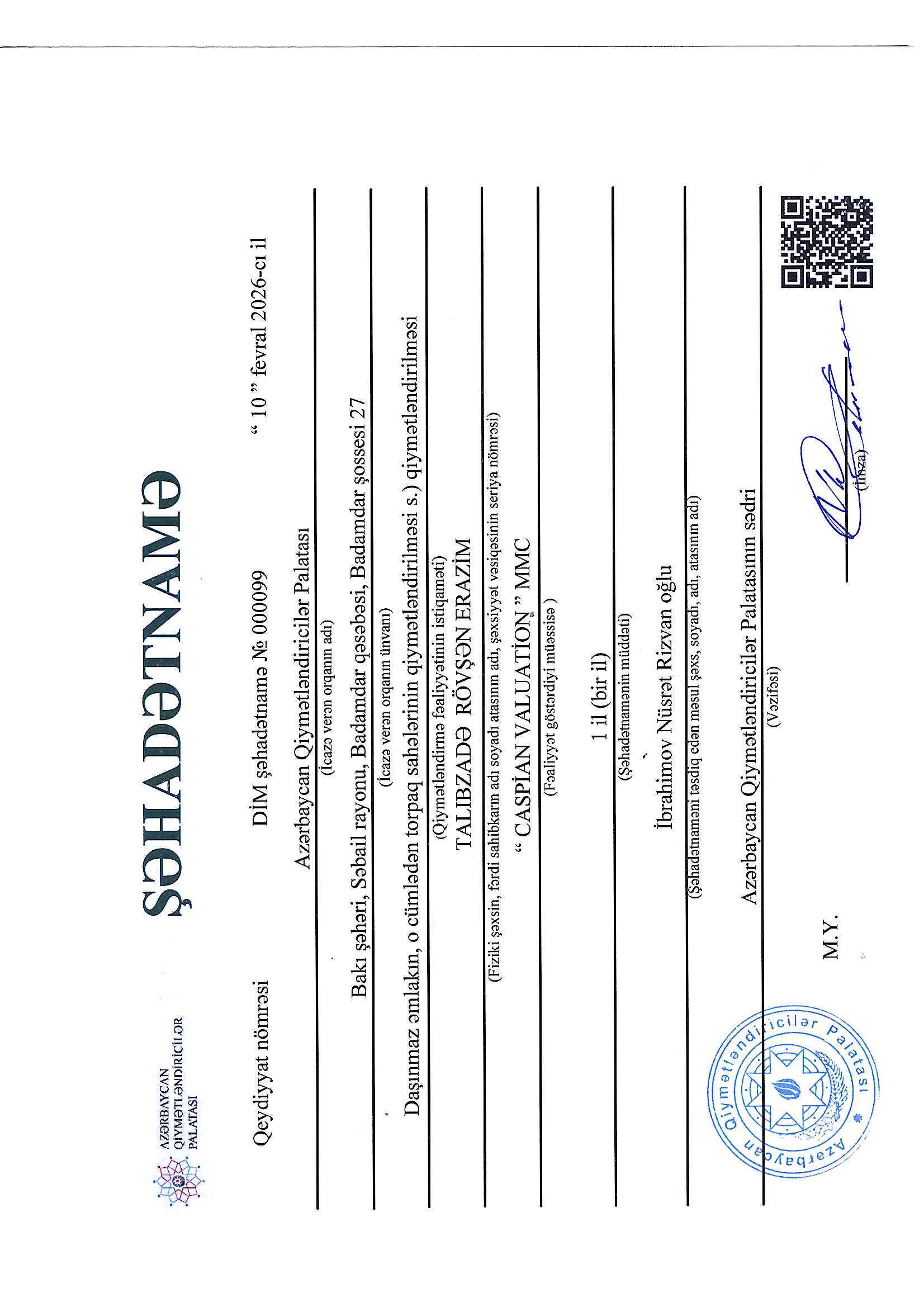 Azərbaycan Qiymətləndiricilər Palatasının üzvü olan «Caspian Valuation» MMC 2011-ci ildən daşınar və daşınmaz əmlakın qiymətləndirilməsi və ekspertizası sahəsində peşəkar təcrübəyə malikdir. Şirkətin 3 əməkdaşı Dövlət İmtahan Mərkəzində keçirilmiş imtahanlarda müvəffəqiyyət qazanaraq Qiymətləndiricinin İxtisas Şəhadatənaməsini əldə etmişlər. «Caspian Valuation» MMC fəaliyyəti üzrə hüquqi və fiziki şəxslərə Azərbaycan Respublikasının “Qiymətləndirmə fəaliyyəti haqqında” Qanununa, Beynəlxalq Qiymətləndirmə Standartlarına (BQS), “Milli Qiymətləndirmə Standartları”na (AzS), “Dövlət Məhkəmə Ekspertizası fəaliyyəti haqqında” Azərbaycan Respublikasının Qanununa müvafiq olaraq xidmət göstərir. Qiymətləndirmə fəaliyyəti ilə yanaşı aşağıdakı xidmətlər də təşkilatın fəaliyyət çərçivəsinə daxildir. Əmtəəşünaslıq, tikinti-texniki ekspertizası; İnventarizasiya; Biznes planların tərtibi; Mal qalığının hesablanması; Eskiz layihələrin çəkilməsi, koordinatların müəyyən edilməsi; Əldən çıxmış faydanın hesablanması; Smeta layihələrinin tərtibi; Dəymiş ziyanın hesablanması; Konsaltinq və kompleks marketinq sahəsi və s.