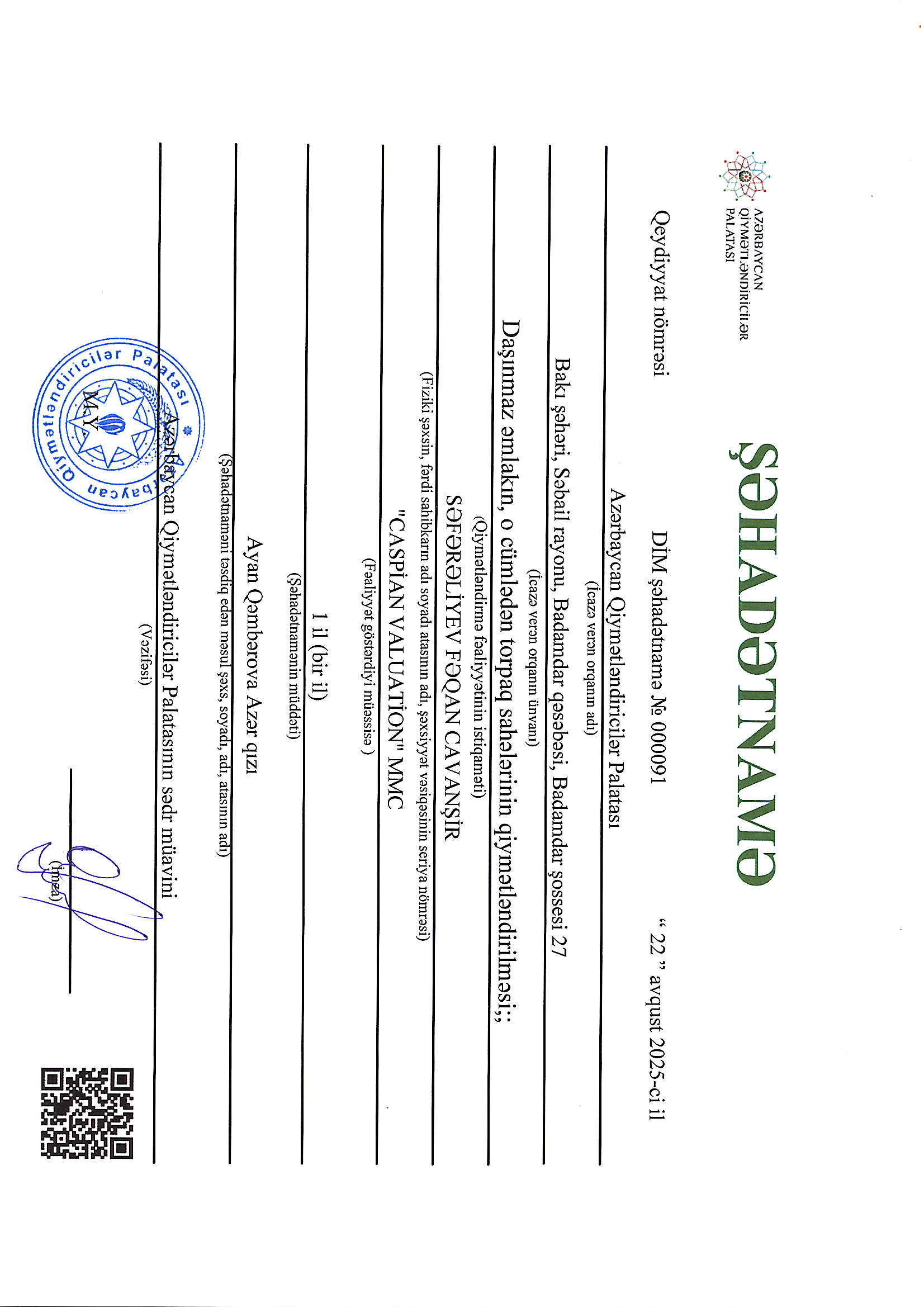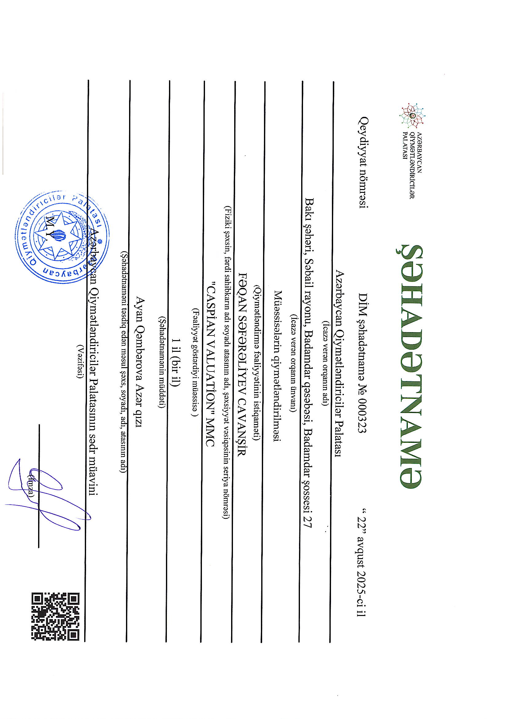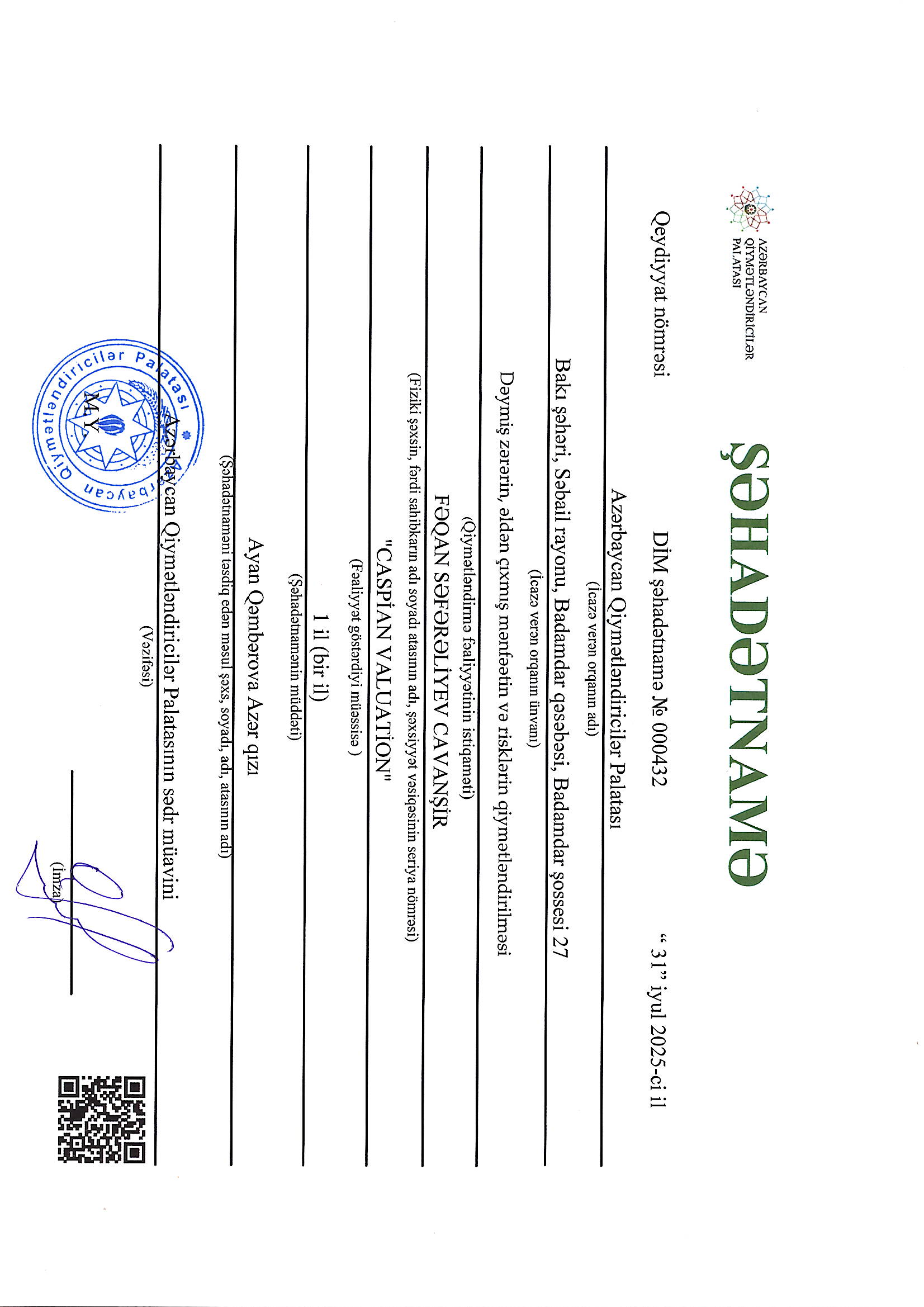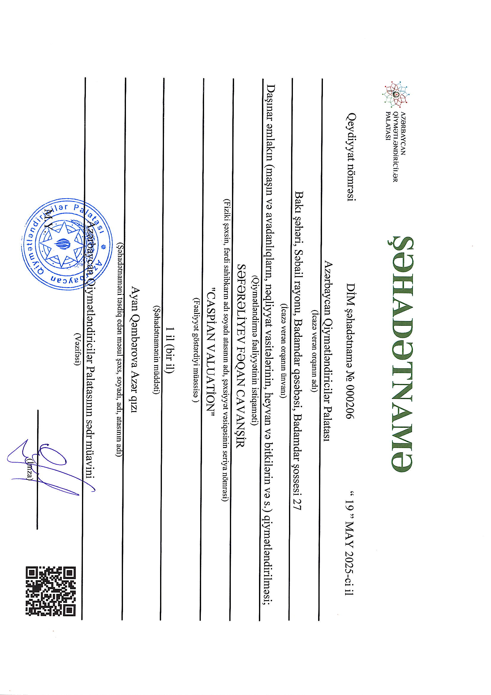 Azərbaycan Qiymətləndiricilər Palatasının üzvü olan «Caspian Valuation» MMC 2011-ci ildən daşınar və daşınmaz əmlakın qiymətləndirilməsi və ekspertizası sahəsində peşəkar təcrübəyə malikdir. Şirkətin 3 əməkdaşı Dövlət İmtahan Mərkəzində keçirilmiş imtahanlarda müvəffəqiyyət qazanaraq Qiymətləndiricinin İxtisas Şəhadatənaməsini əldə etmişlər. «Caspian Valuation» MMC fəaliyyəti üzrə hüquqi və fiziki şəxslərə Azərbaycan Respublikasının “Qiymətləndirmə fəaliyyəti haqqında” Qanununa, Beynəlxalq Qiymətləndirmə Standartlarına (BQS), “Milli Qiymətləndirmə Standartları”na (AzS), “Dövlət Məhkəmə Ekspertizası fəaliyyəti haqqında” Azərbaycan Respublikasının Qanununa müvafiq olaraq xidmət göstərir. Qiymətləndirmə fəaliyyəti ilə yanaşı aşağıdakı xidmətlər də təşkilatın fəaliyyət çərçivəsinə daxildir. Əmtəəşünaslıq, tikinti-texniki ekspertizası; İnventarizasiya; Biznes planların tərtibi; Mal qalığının hesablanması; Eskiz layihələrin çəkilməsi, koordinatların müəyyən edilməsi; Əldən çıxmış faydanın hesablanması; Smeta layihələrinin tərtibi; Dəymiş ziyanın hesablanması; Konsaltinq və kompleks marketinq sahəsi və s.